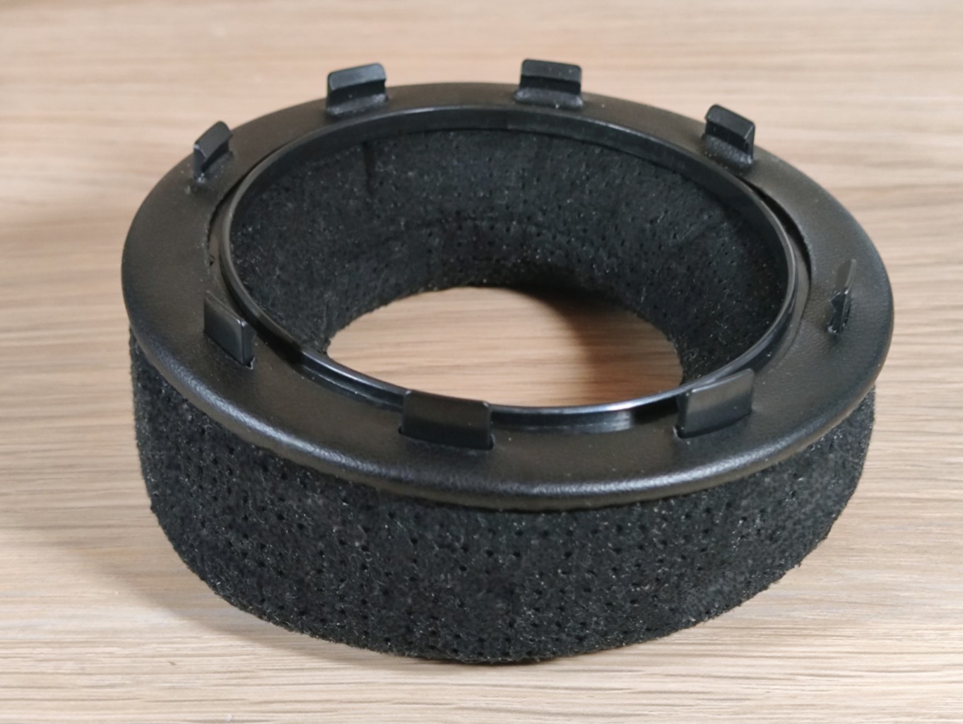 The pads are made of semi firm, comfortable foam with a synthetic suede like material that is fenestrated with small holes on all sides. They’re almost circular, measuring 10 x 9 cm on the outside with a 6 x 5 cm internal opening. The pads are attached to plastic rings using the widespread lip-and-groove attachment design. The plastic ring easily clicks into place. This design means that standard circular pads would work, making pad swapping very accessible.