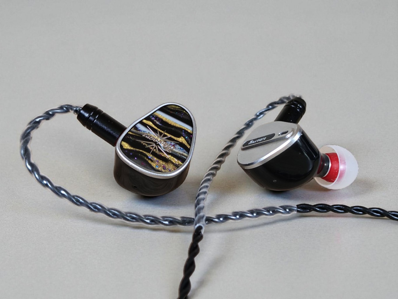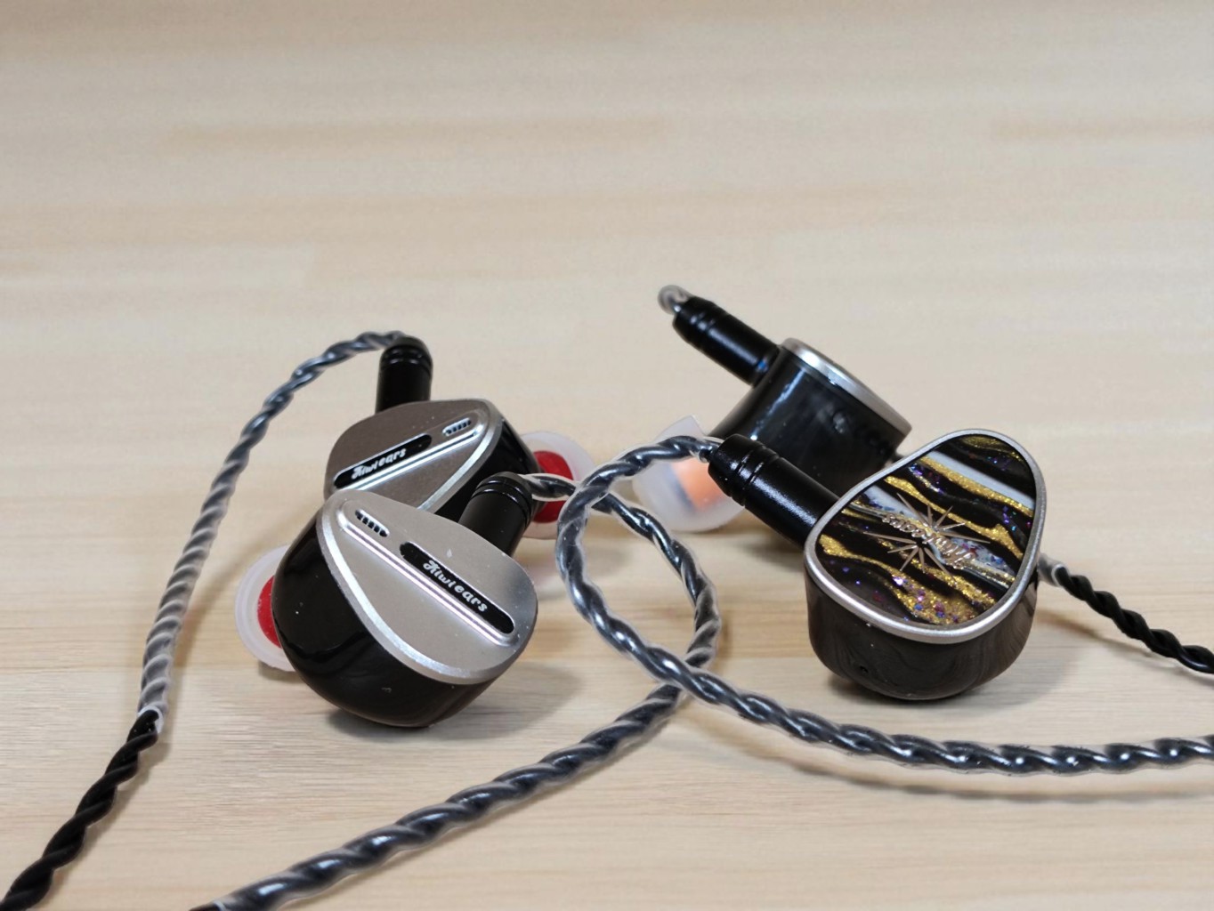 Both have resin shell designs with attached faceplates. The Étude has resin nozzles, while the Airoso has metal ones. The Étude is larger, but both are comfortable for me. They have identical cables—standard thin Kiwi Ears cables with 3.5 mm jacks.