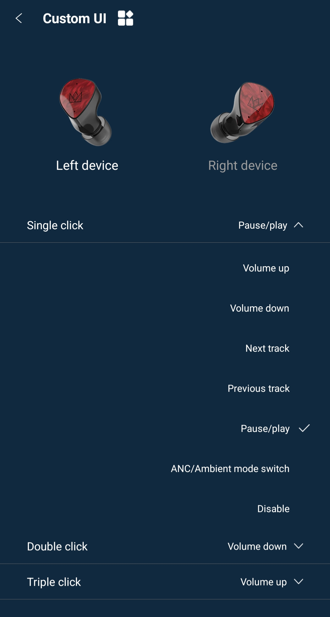 Single, double, and triple tap functions can be customized to your preference within the app. Here are the options: