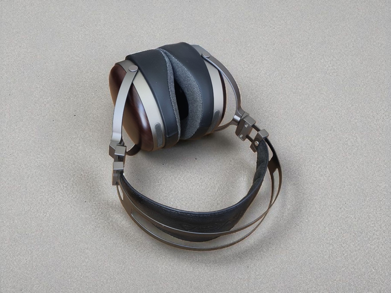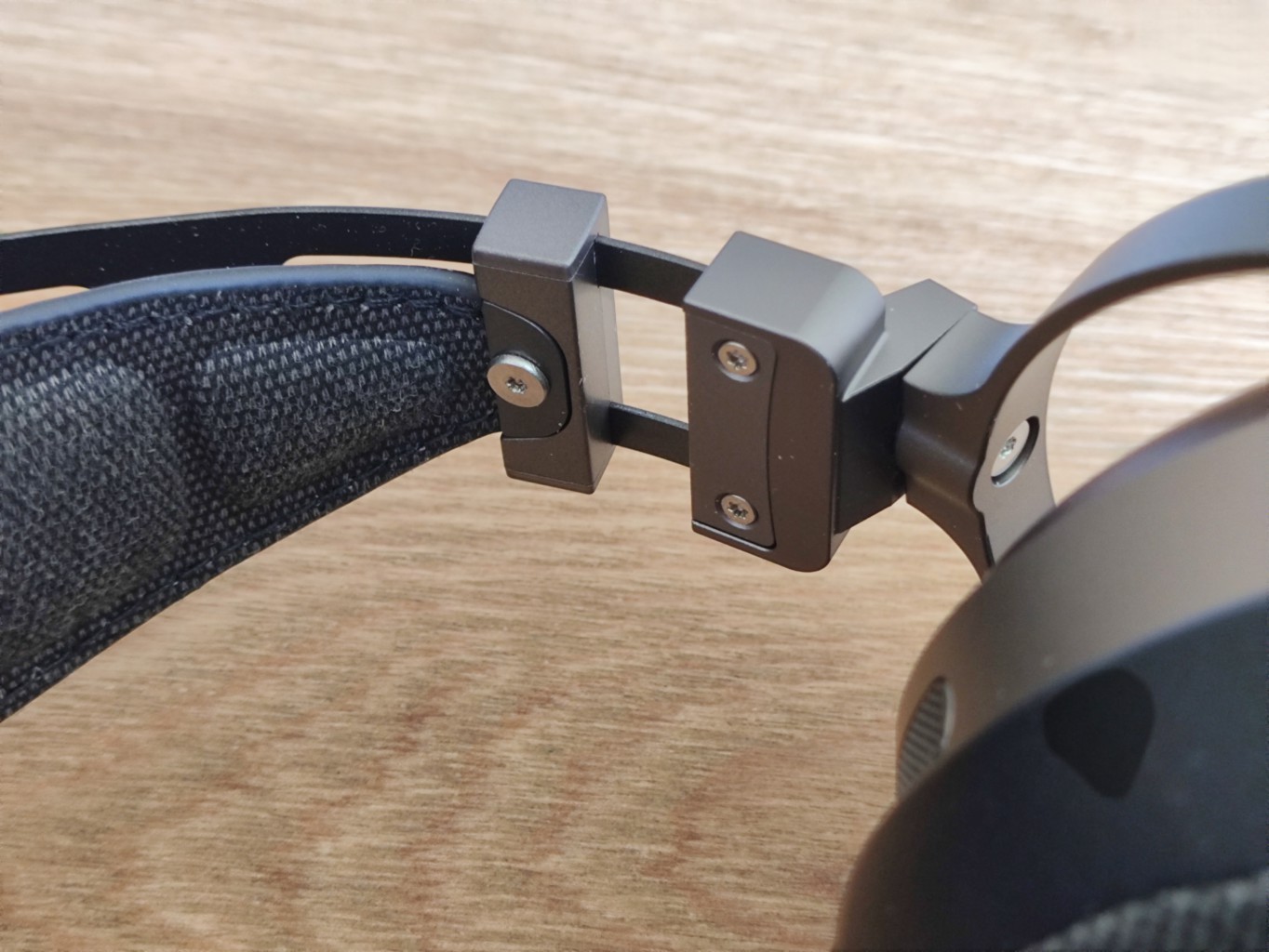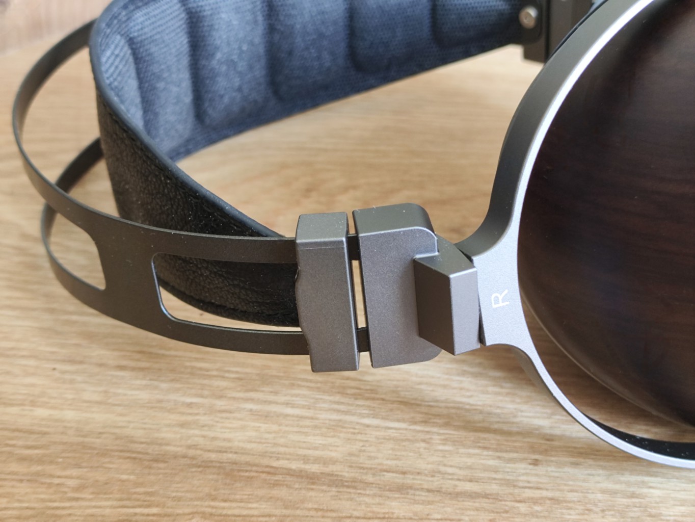 The headband assembly is entirely metal, with CNC-machined parts finished in a gunmetal-colored anodizing, which also goes for yokes and the ring surrounding the wooden cups. The yoke design allows the ear cups to rotate 180 degrees, providing compact storage and great swivel action.