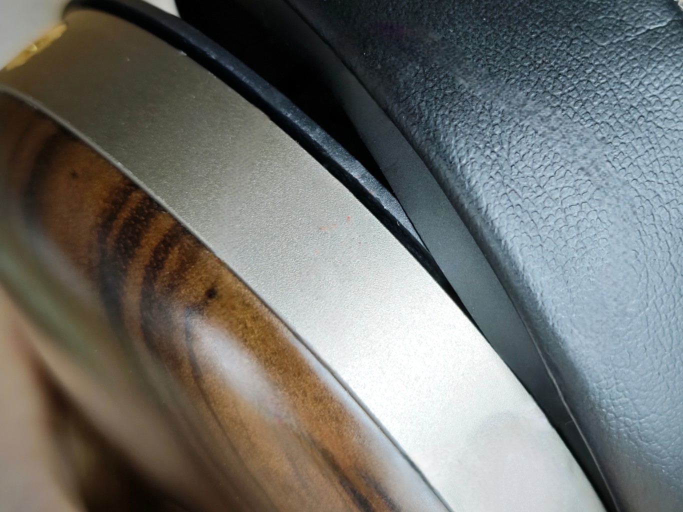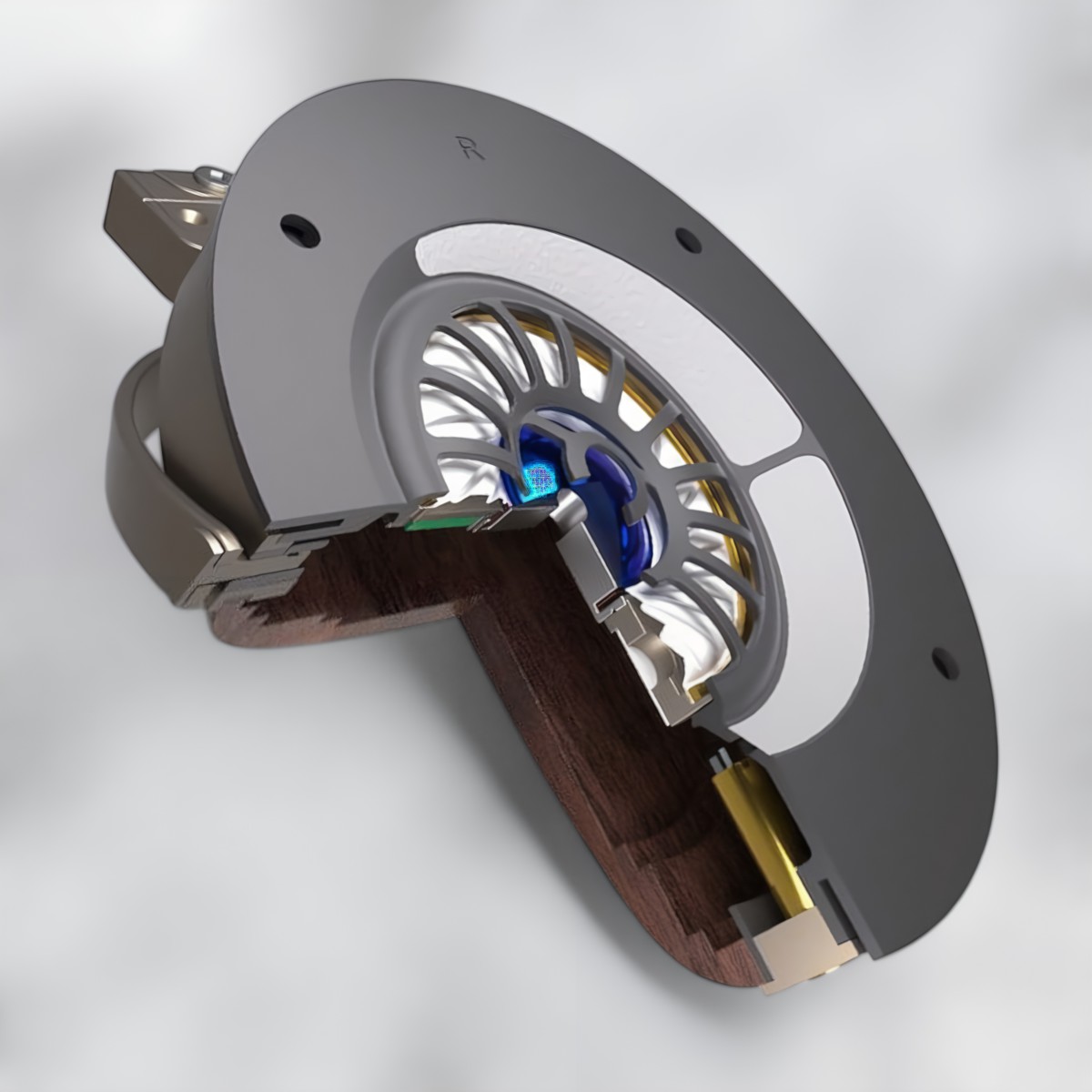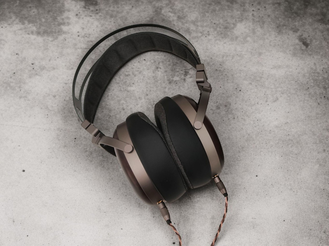 The headband assembly is entirely metal, with CNC-machined parts finished in a gunmetal-colored anodizing, which also goes for yokes and the ring surrounding the wooden cups. The yoke design allows the ear cups to rotate 180 degrees, providing compact storage and great swivel action.