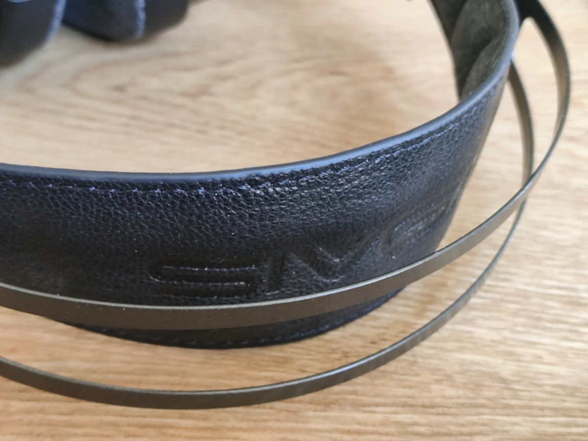 The headband features an arc-and-strap design. A dual spring steel arc, highly flexible, provides the structural support, while the suspended strap ensures that the headphones rests comfortably on your head. The strap is made of lambskin on top, with a textile underside and light padding for added comfort. The strap can be adjusted up and down with sliders to accommodate different head sizes.