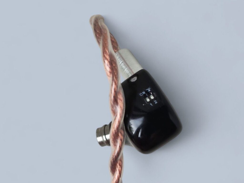 The 3D-printed resin housing is visually appealing, lightweight, and comfortable. Each earpiece features two tuning switches for bass quantity customization. The included braided copper cable is of high quality, with an unusually well-shaped bend (ear hook) closest to the IEM giving improved fit and ergonomics.