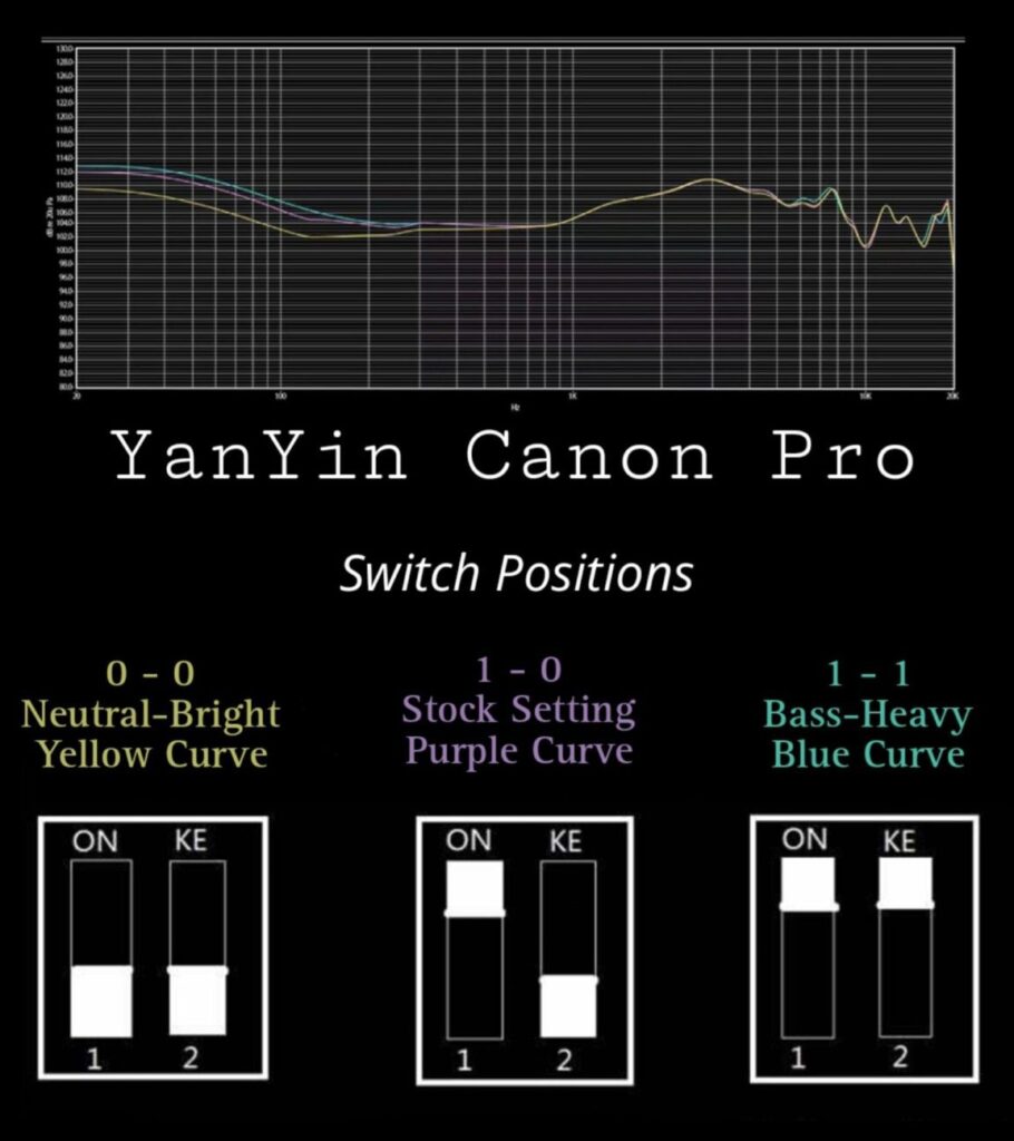 The sound signature of the YanYin Canon Pro changes slightly with the switch settings, but not by much. With the medium bass 1-0 setting, the bass is relatively modest in quantity, the mids are well-balanced, and the treble is crisp and clear without being aggressive.